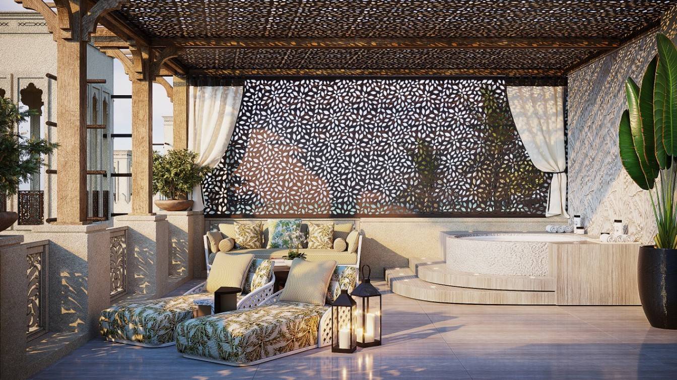 Un hogar de verano de suntuoso diseño arabesco con unas deleitantes vistas al mar, una terraza privada, un majlis tradicional y un soberbio baño revestido de mármol. Relajación, recuperación y renovación a tan solo unos pasos