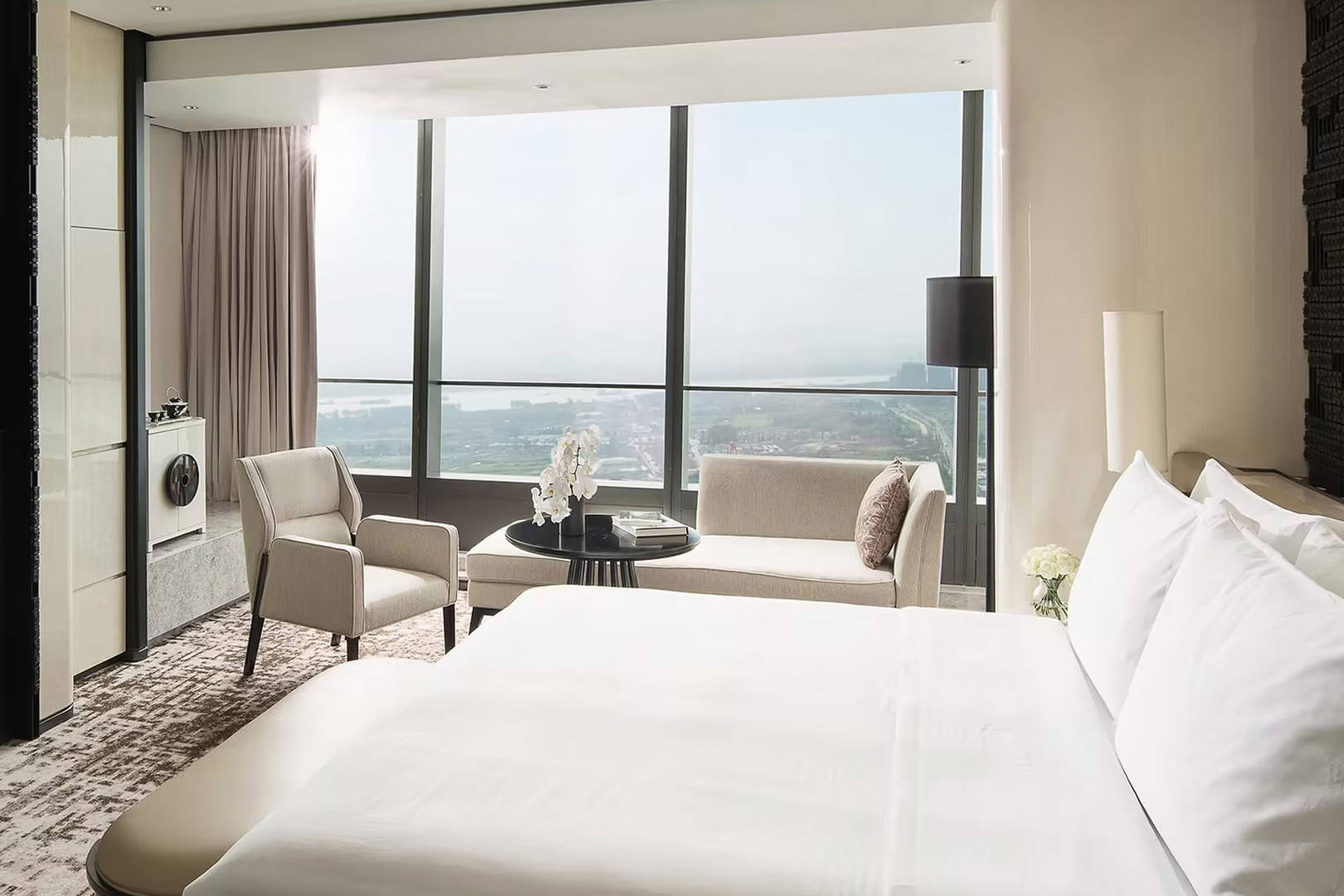 Look out across the Yangtze River from this spacious suite — combining natural materials and designs inspired by local culture to create a sense of luxurious calm